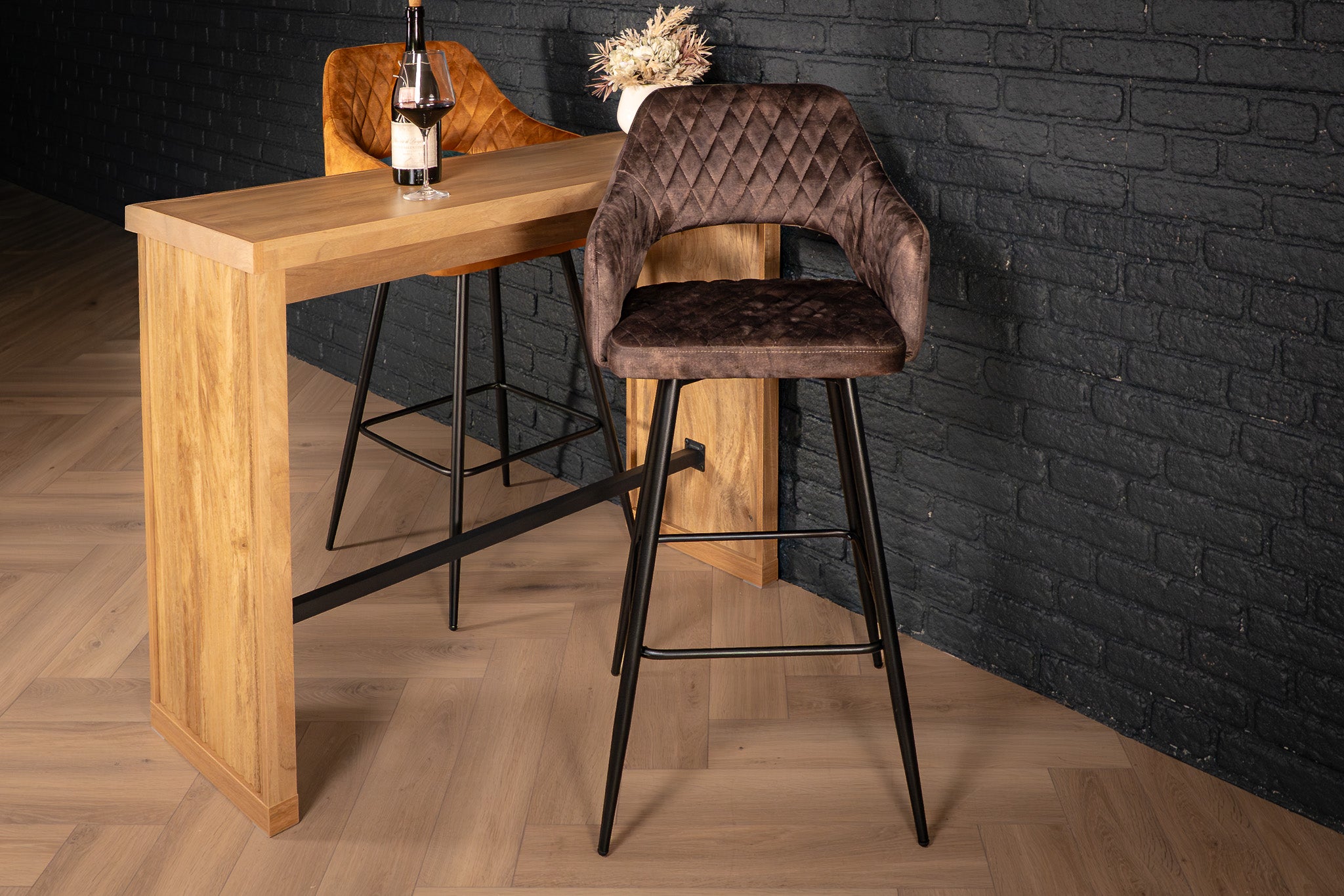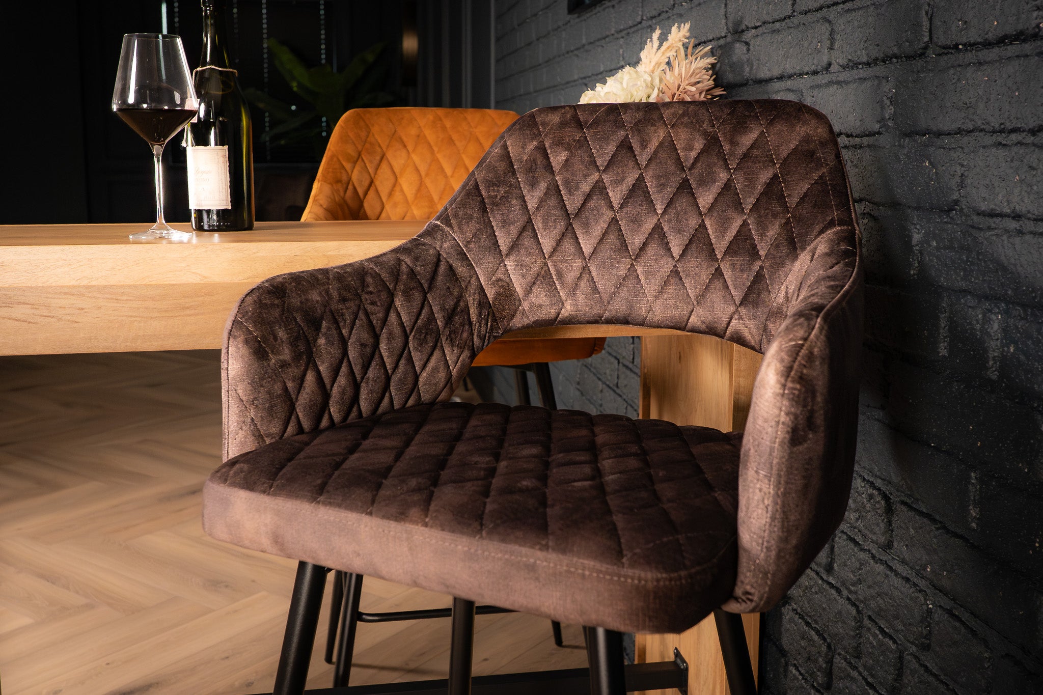 Looking to add a touch of refined glamor to your home bar or kitchen counter? This Glamour Elegant Velvet Barstool is the perfect statement piece. The soft purple grey velvet upholstery paired with graceful diamond quilting on the backrest evokes retro elegance, while the open-sided arm design keeps the silhouette light and inviting. Slim, black powder-coated legs lend a sleek, contemporary edge and ensure a sturdy base. With its comfy armrests and supportive footrest, this stool is made for lingering long into the evening—whether sipping cocktails or sharing good conversation.