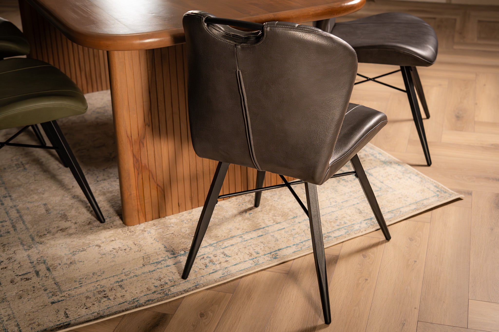 The Orion Dining Chair brings timeless elegance to modern interiors. Its gently contoured backrest, accented with vertical channel stitching, offers both ergonomic support and refined styling. Upholstered in durable grey faux leather, it combines the look of genuine hide with practical low-maintenance appeal. The black powder-coated metal legs add a sleek, industrial edge, creating a dynamic contrast to the soft curves of the seat. Whether used around the dining table or in a professional setting, Orion delivers comfort, character, and versatility.