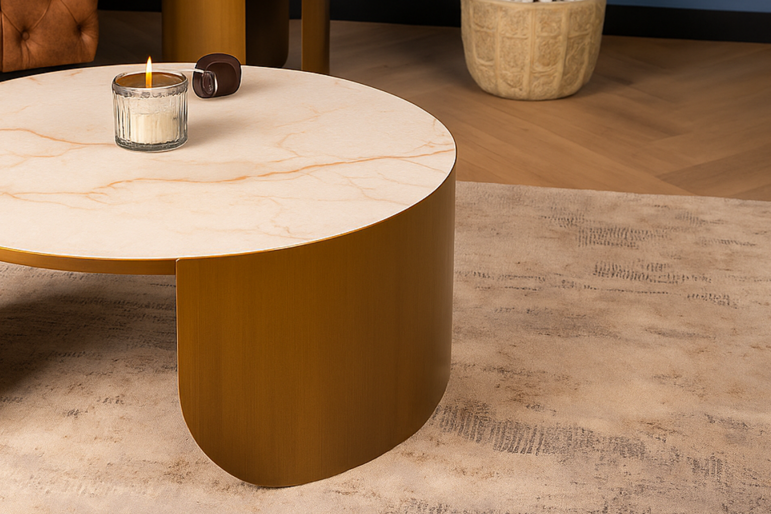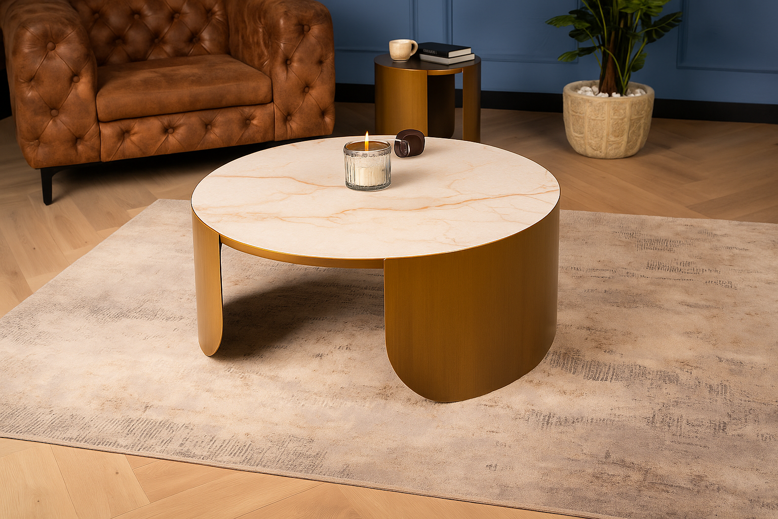 Petroio Italian Sintered Stone Round Coffee Table in White Concrete Gold Marble Look 90 cm