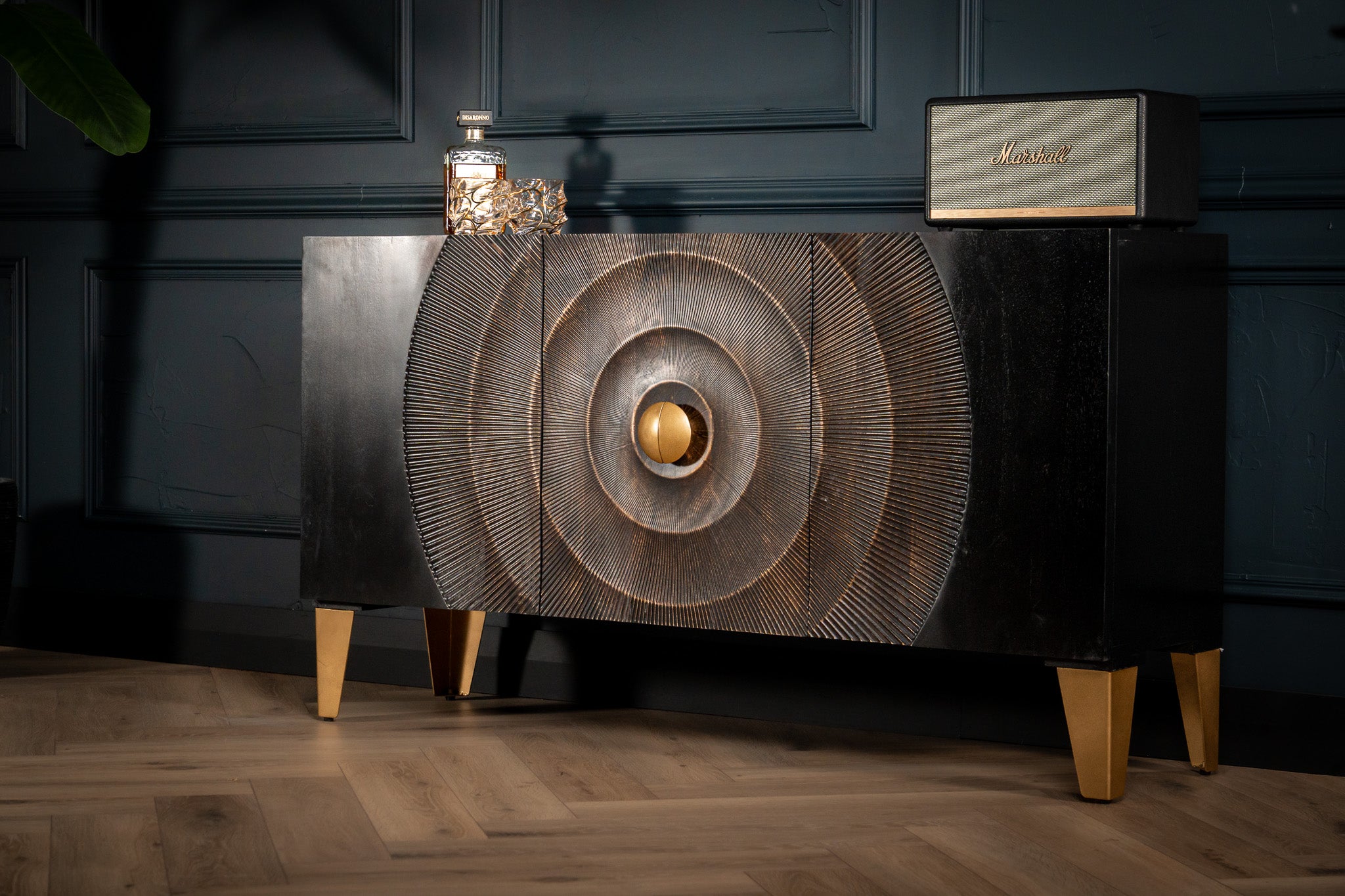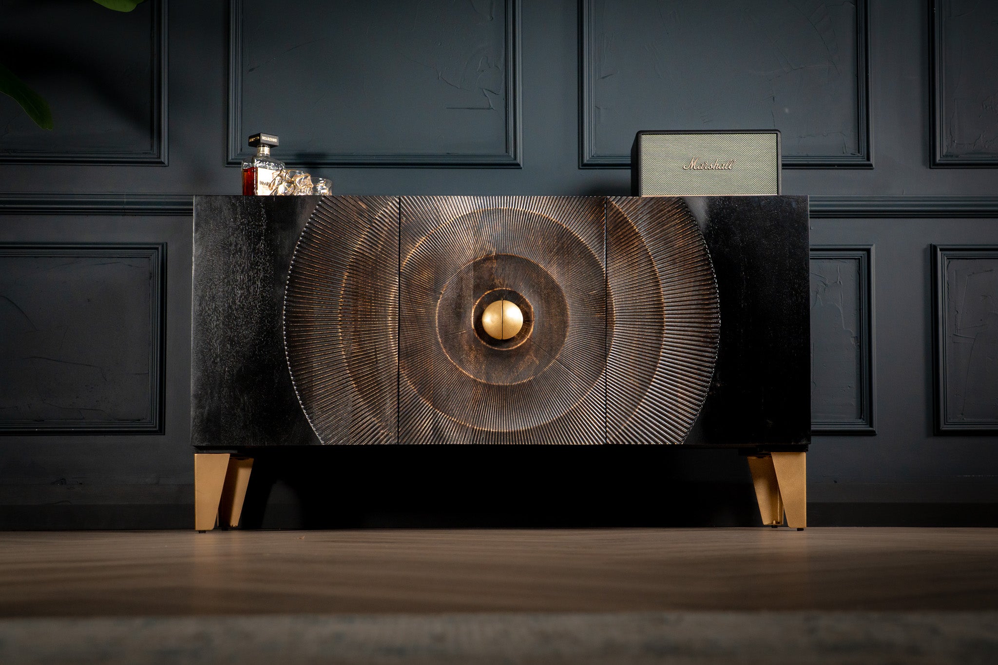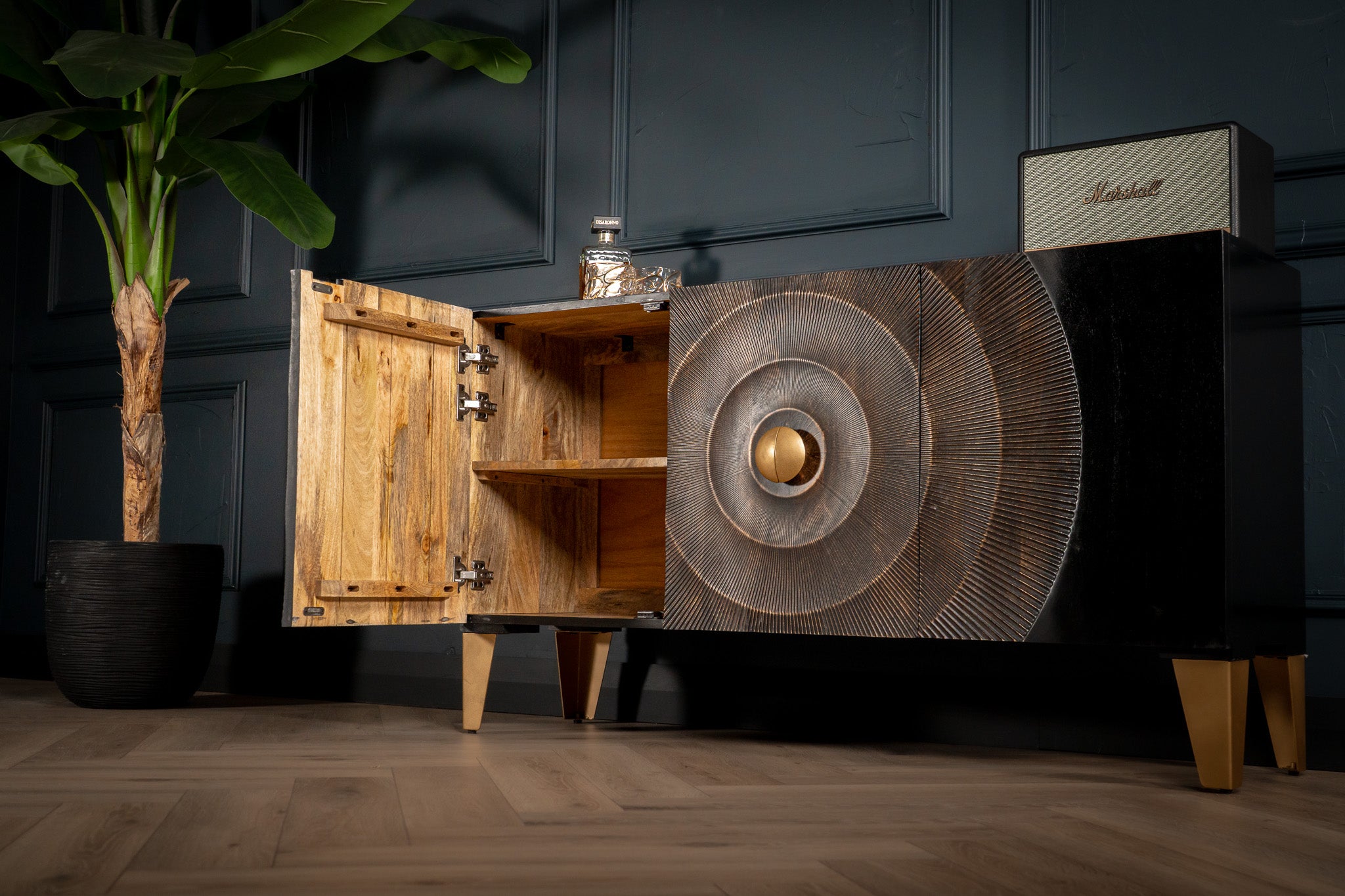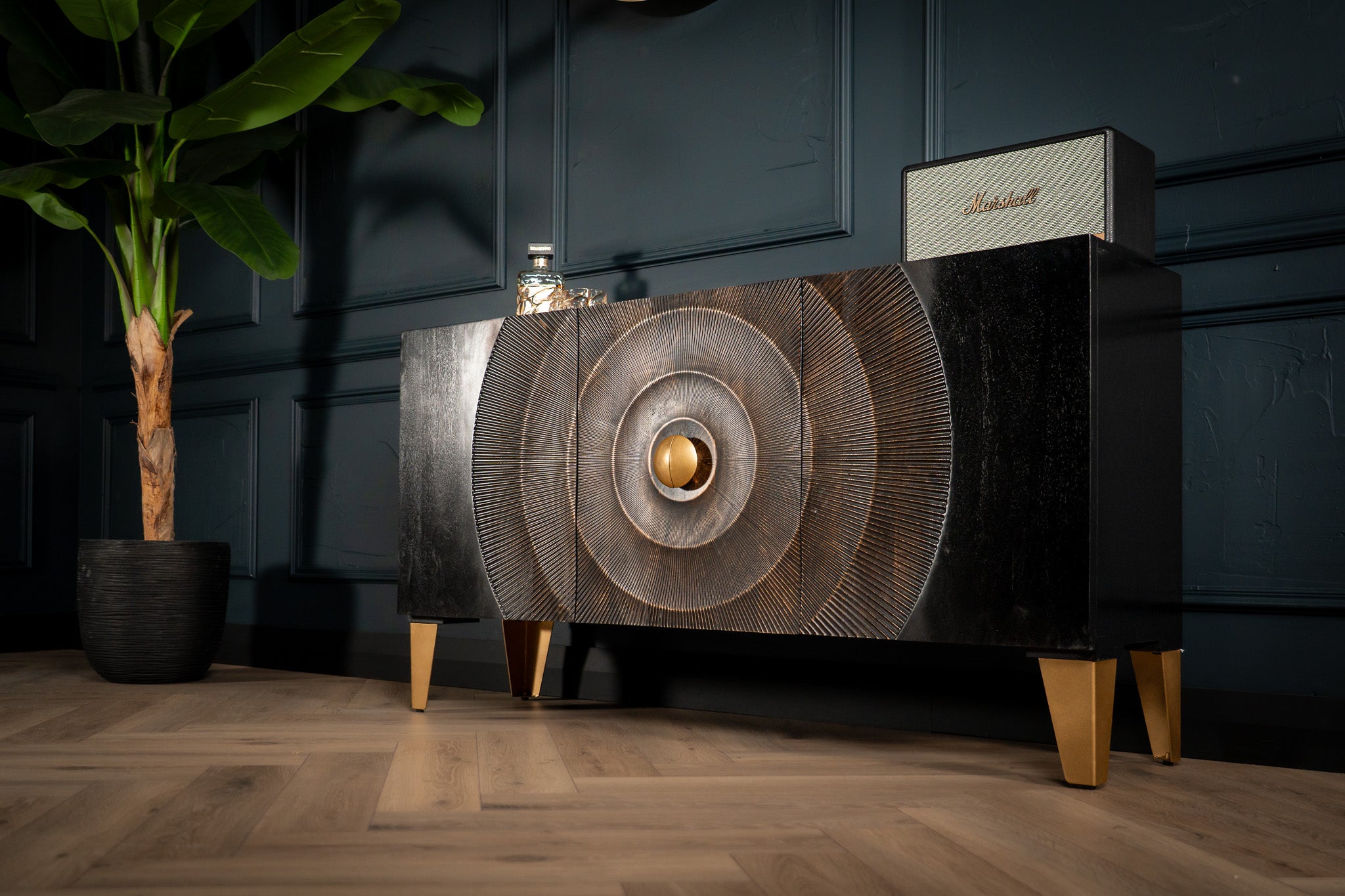 The Sunset Sideboard combines generous storage space with striking design. Its solid mango wood body in deep black is elevated with an elaborate golden ornament across the front. Finished with matching golden legs and a coordinating knob, this piece balances functionality with standout luxury.