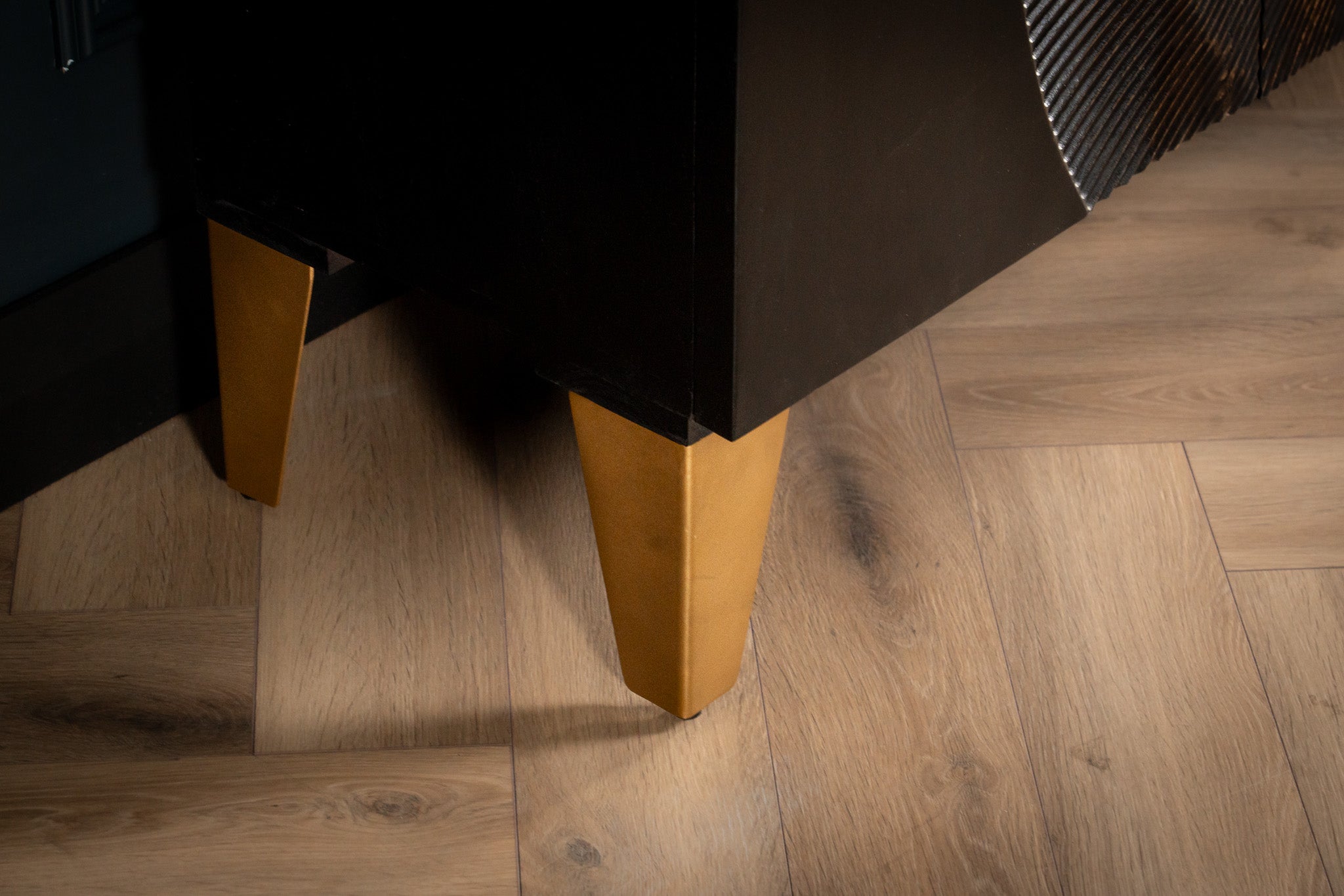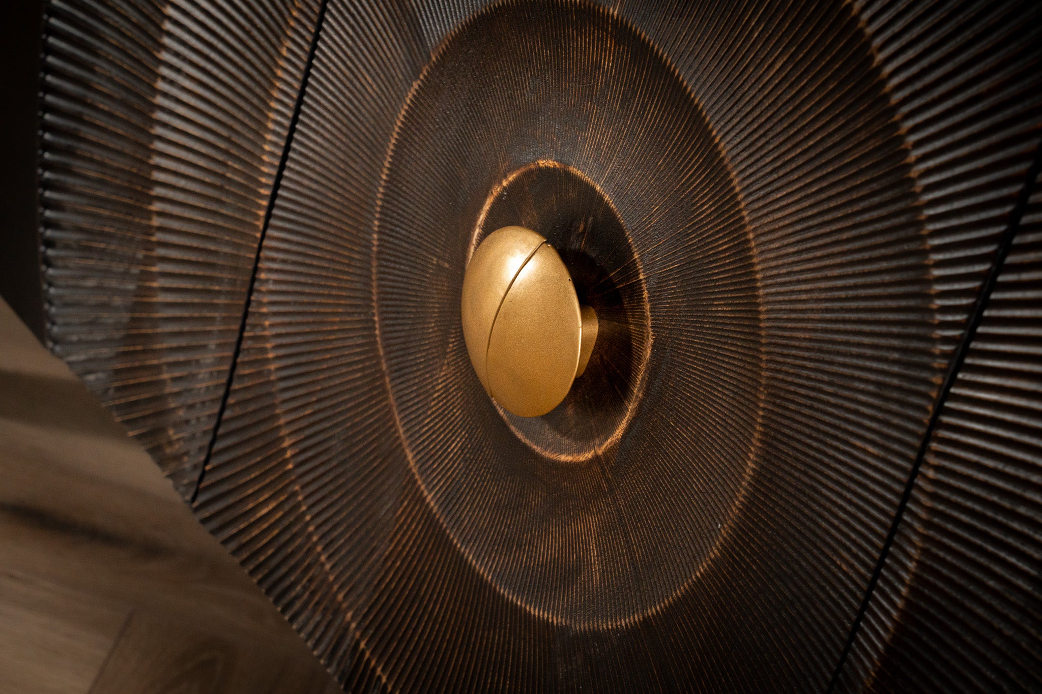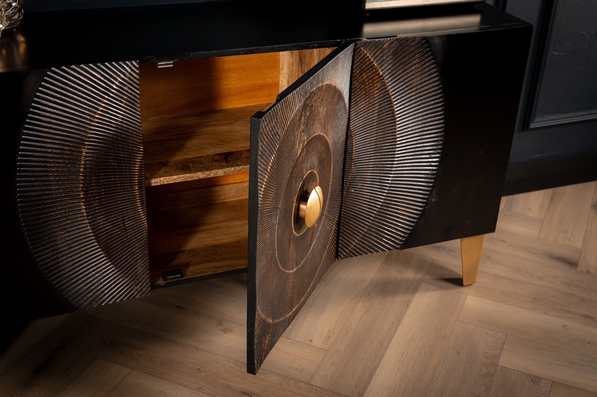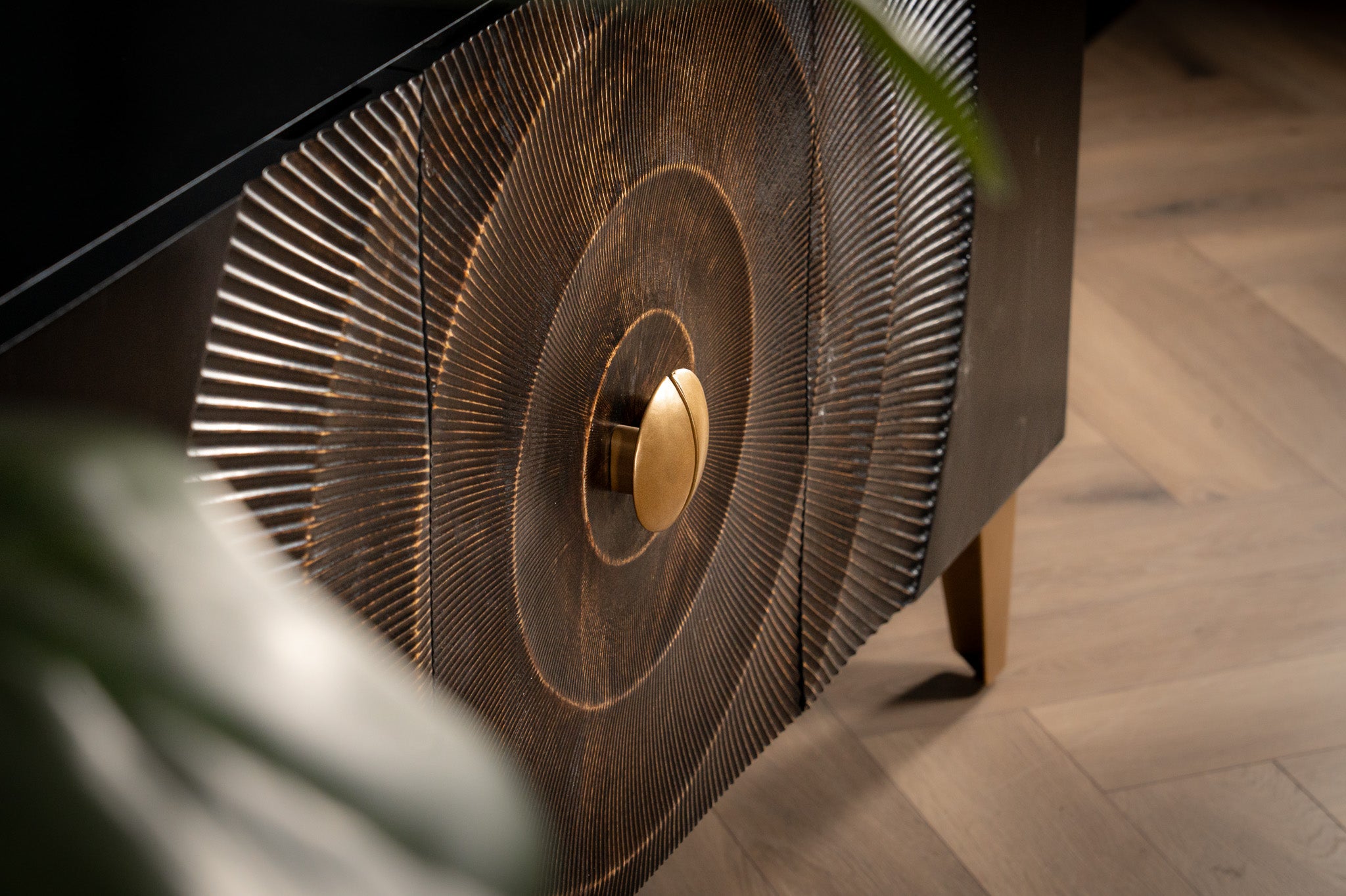 The Sunset Sideboard combines generous storage space with striking design. Its solid mango wood body in deep black is elevated with an elaborate golden ornament across the front. Finished with matching golden legs and a coordinating knob, this piece balances functionality with standout luxury.