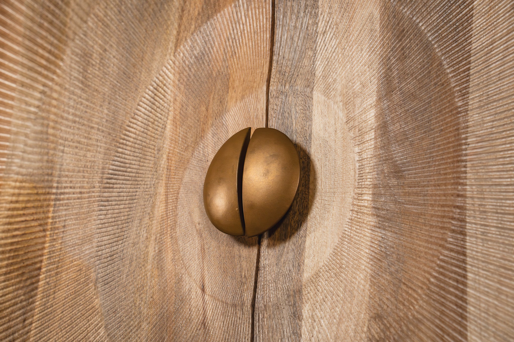 Sculptural front: circular handcrafted carving creates an illusion of movement and light