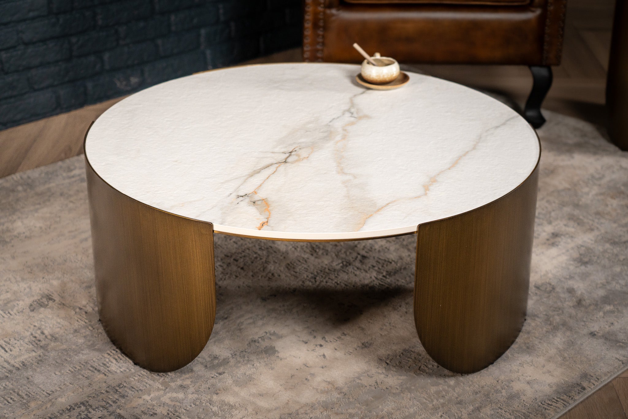 Petroio Italian Sintered Stone Round Coffee Table in White Concrete Gold Marble Look 90 cm