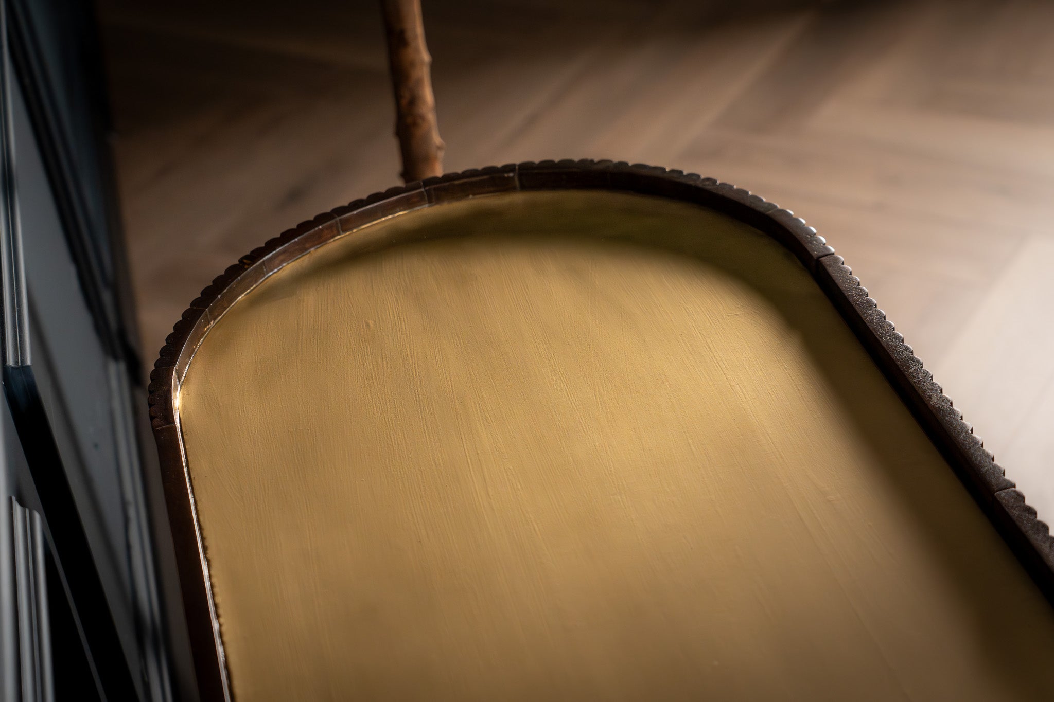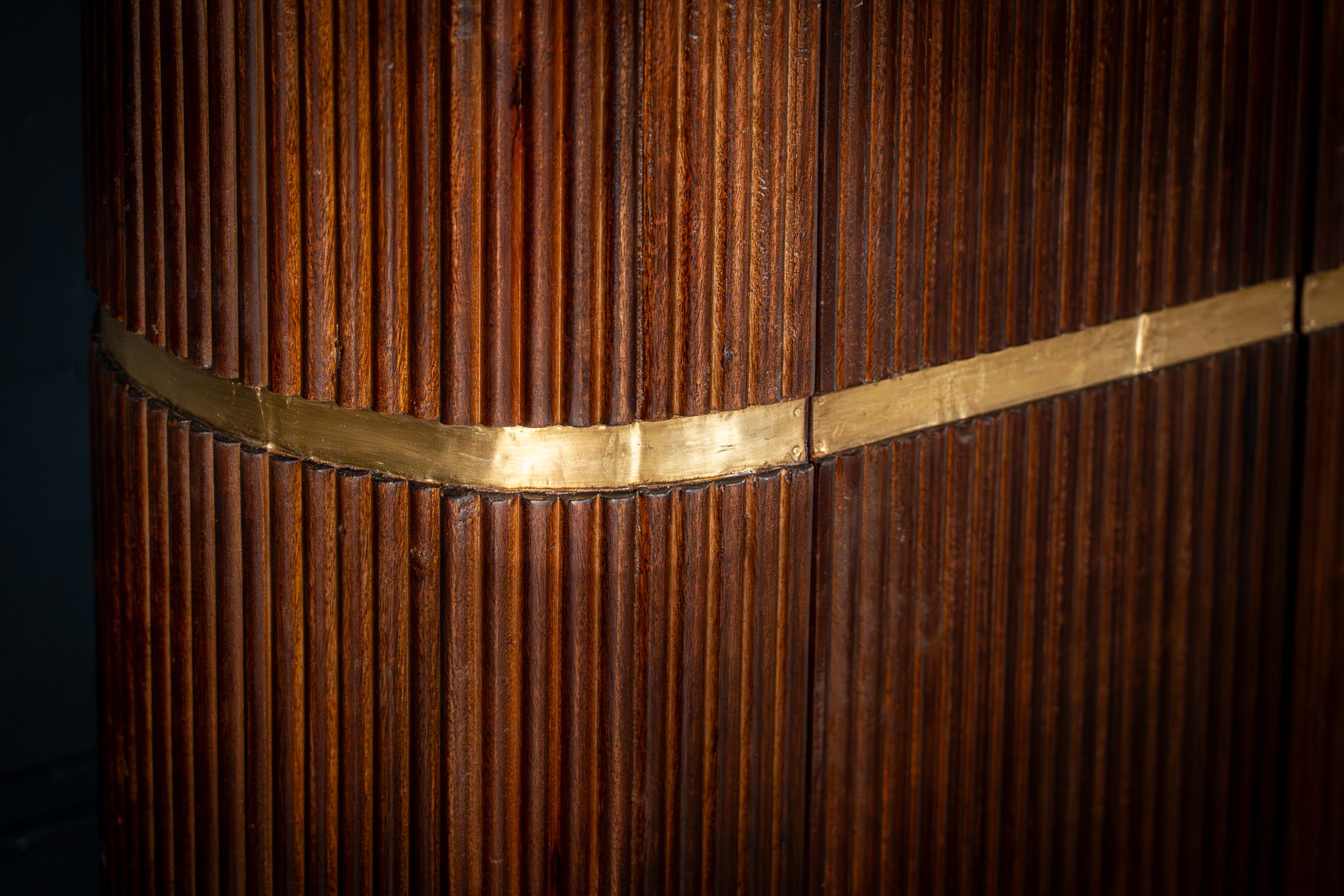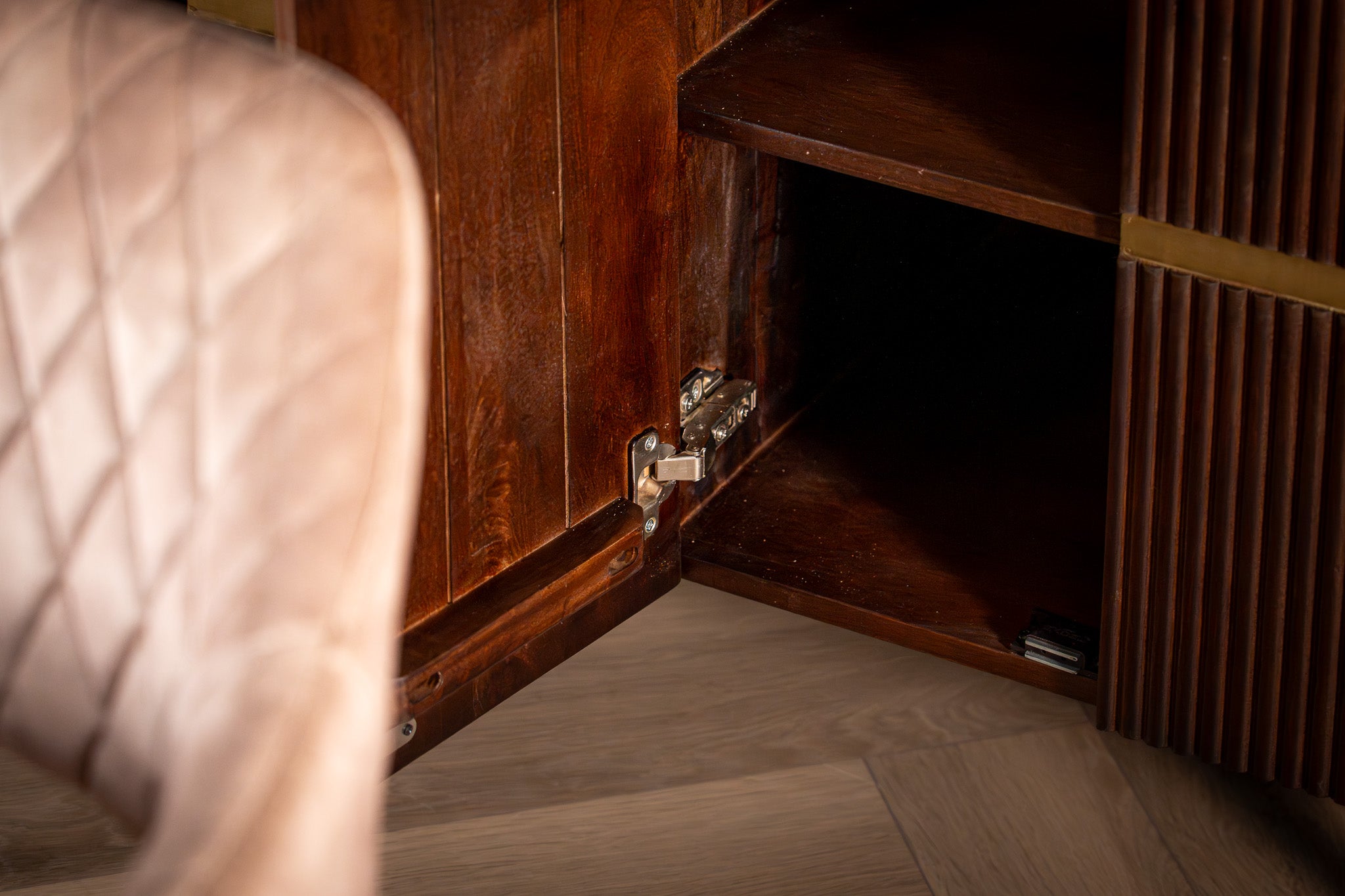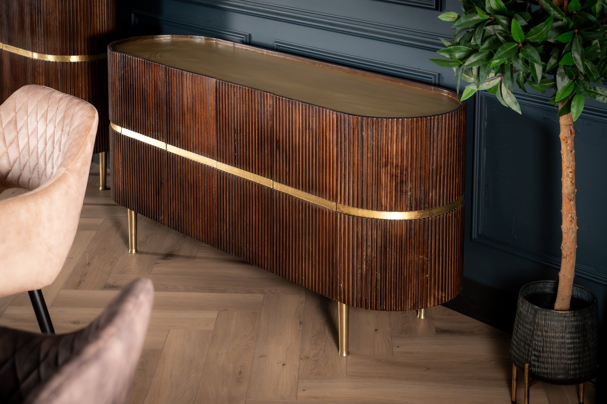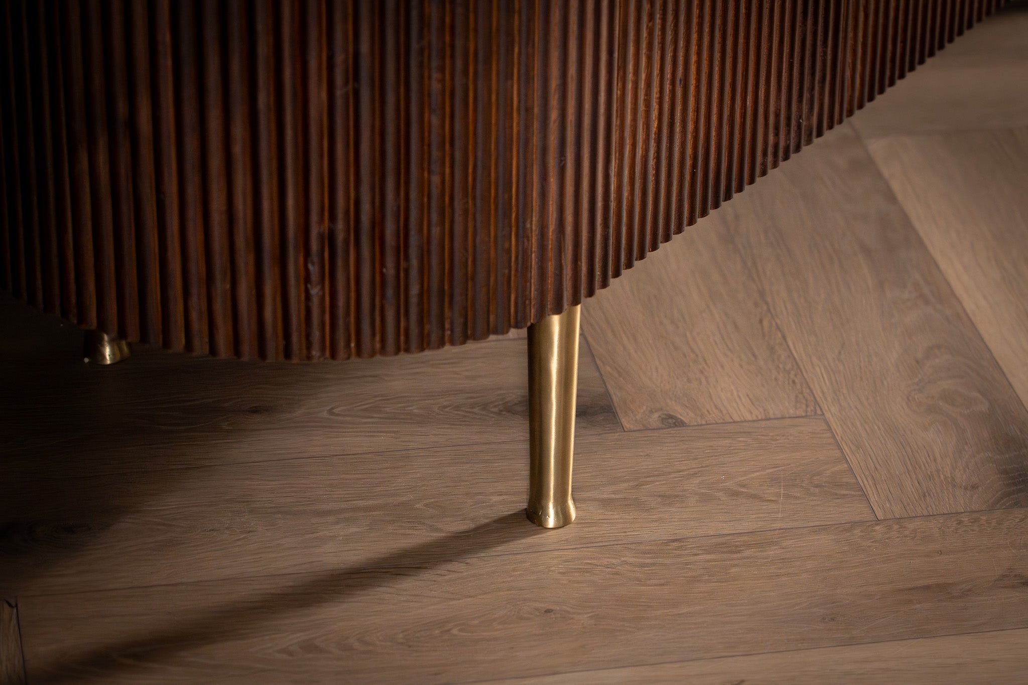 This sophisticated sideboard redefines contemporary elegance with its sculptural form and refined details. Expertly handcrafted from durable solid mango wood, it features a fluted façade that highlights the natural depth of its deep brown finish. The gently rounded corners soften the bold geometry, creating a harmonious flow that stands out as a design statement. A striking horizontal brass-finished inlay runs across the front, adding subtle contrast and enhancing its architectural rhythm. Resting on slender, gold-finished cone legs, the sideboard combines lightness with stability. Behind its beautifully detailed façade lies generous storage, offering both practicality and style.A timeless centrepiece, this piece merges craftsmanship with luxury, perfectly suited for modern living or dining interiors.