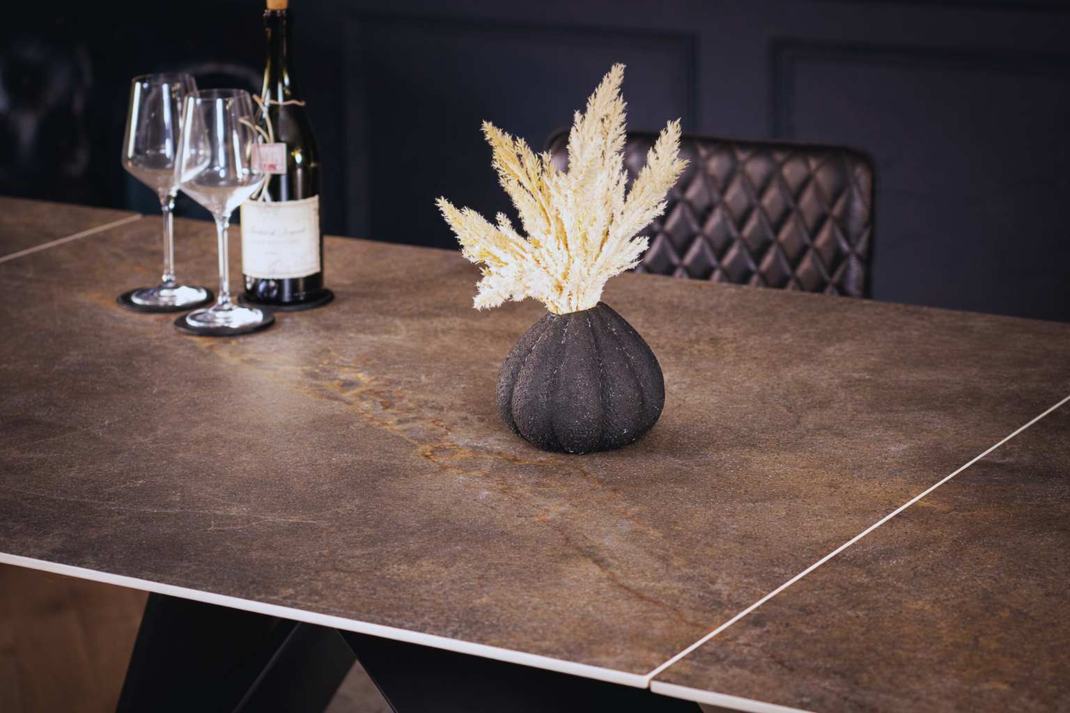 The Apollo sintered stone extendable dining table encapsulates modern elegance with its robust, angular geometric base supporting a luxurious expanse of top-grade Italian stone. The design of the Apollo table is characterised by its innovative, angular base, which not only provides exceptional stability but also acts as a sculptural element in its own right. Crafted from premium materials, the base is designed to be both a functional support and a statement piece, enhancing the sophistication of any dining space.