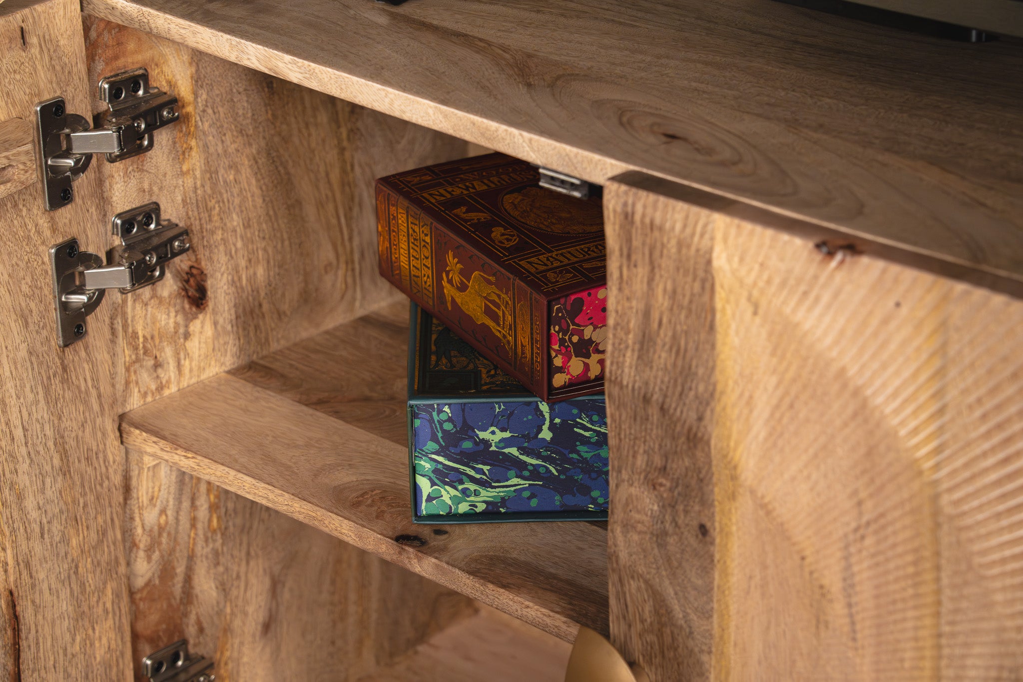 Its most captivating feature is the intricately hand-carved front: a pair of cabinet doors adorned with concentric arc patterns that radiate from a central golden knob. These carved motifs create a sense of fluid movement and depth, reminiscent of setting suns or meditative ripples in still water. The natural finish brings out the unique grain and tonal variations of mango wood, celebrating its raw beauty while enriching your space with tactile appeal.