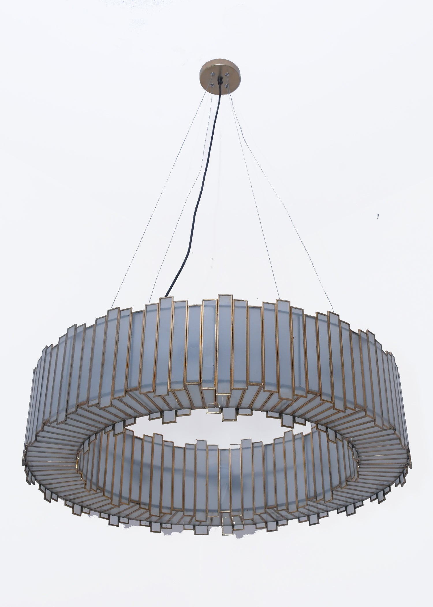 Evoking the quiet beauty of the aurora, this chandelier embodies balance, geometry, and light. Its circular form — handcrafted from glass, iron, and brass — appears suspended in air, exuding effortless sophistication. The interplay between the metallic frame and the luminous glass creates a serene glow, perfect for enhancing dining rooms, living areas, or grand entryways. Every piece is handcrafted, making each chandelier a unique expression of artistry and elegance.
