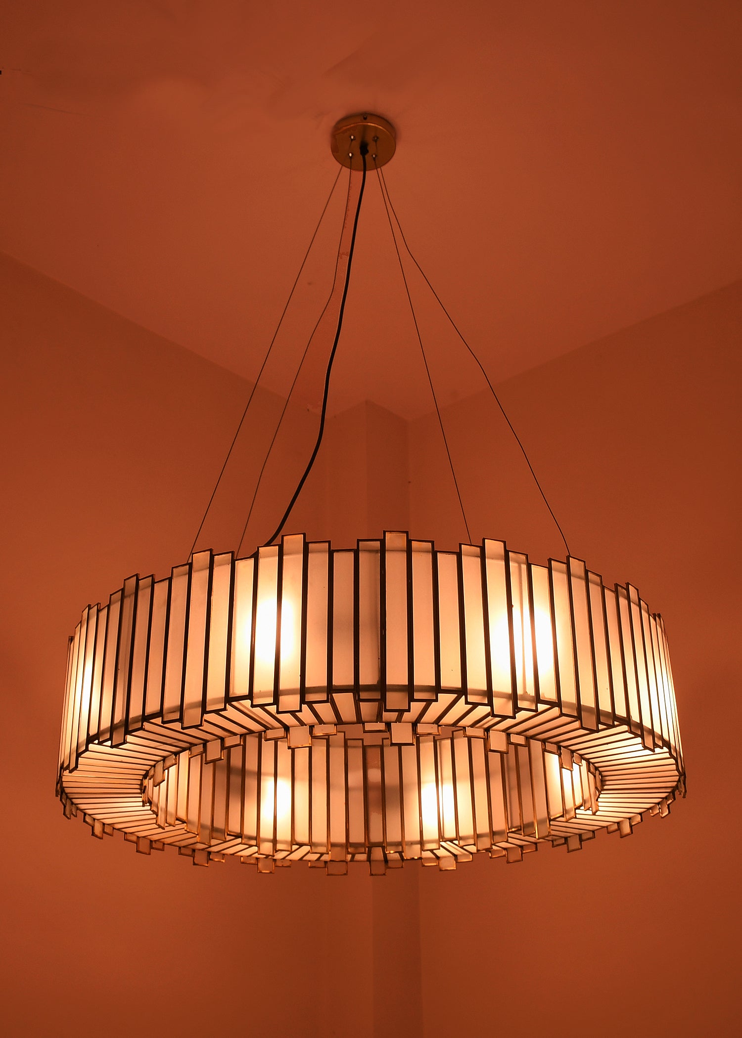 Frosted glass diffuses a warm, golden radiance, enhancing both intimacy and atmosphere.