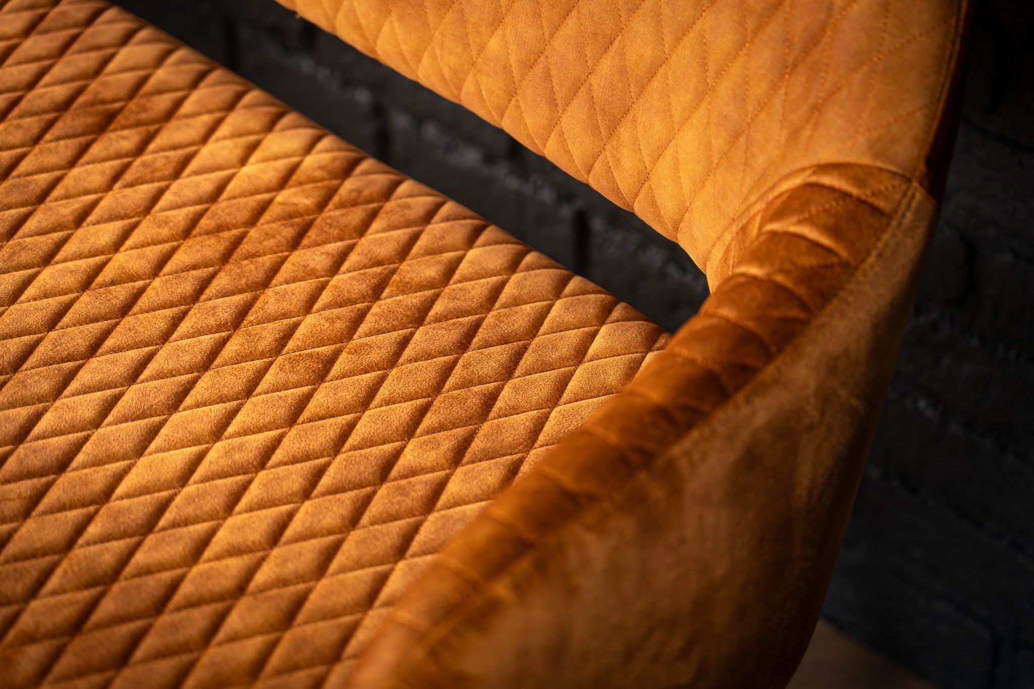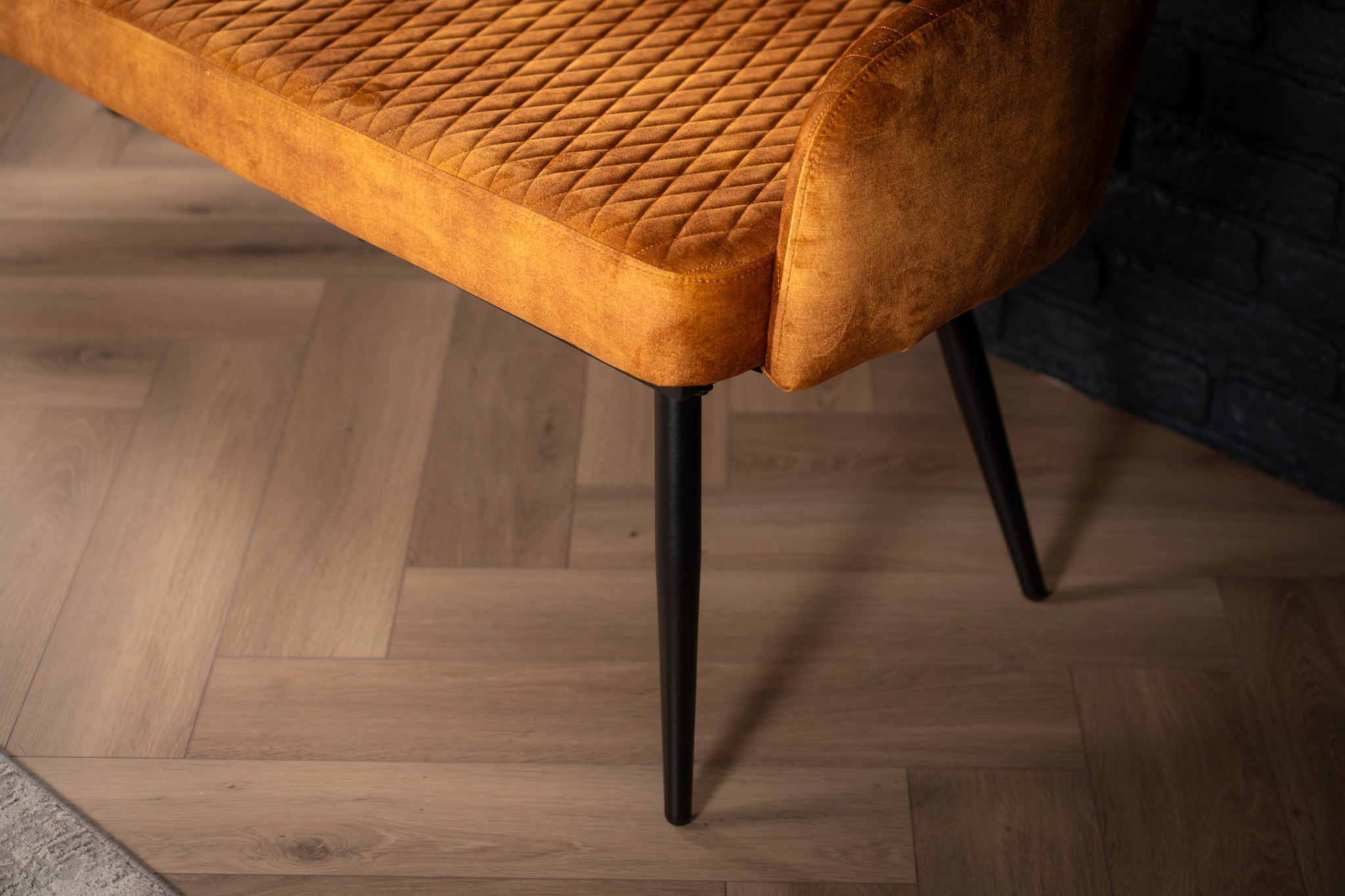 Supported by sleek black powder-coated legs, the bench features an elegantly quilted diamond-pattern backrest, gently curved armrests, and plush cushioning that invites relaxation. Its clean silhouette and premium materials make it a versatile piece that harmonises with industrial, contemporary, and luxe interior themes. Whether styled under a dining table or placed against a feature wall, it brings instant character and class.