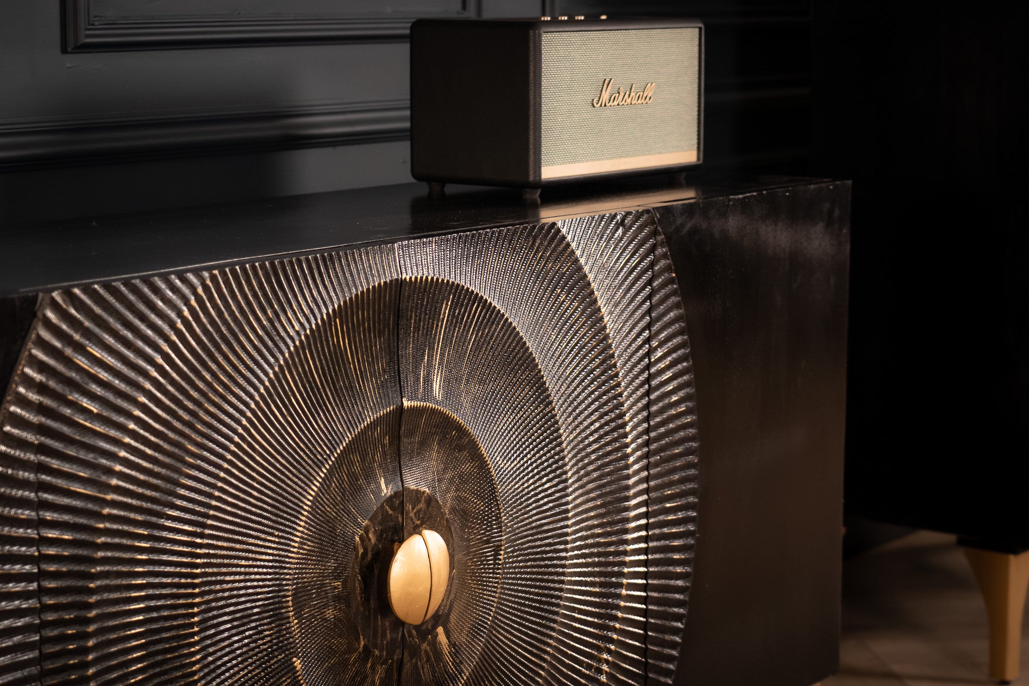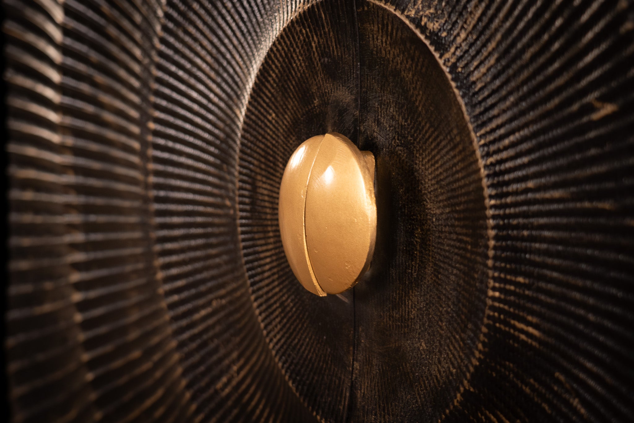 TheSunset Sideboard combines functionality and striking design. Its body is crafted from black mango wood, while the front showcases a stunning golden ornament, bringing radiance and sophistication into any room. Matching gold-finished feet and door knobs complete the look, making this sideboard as decorative as it is practical.