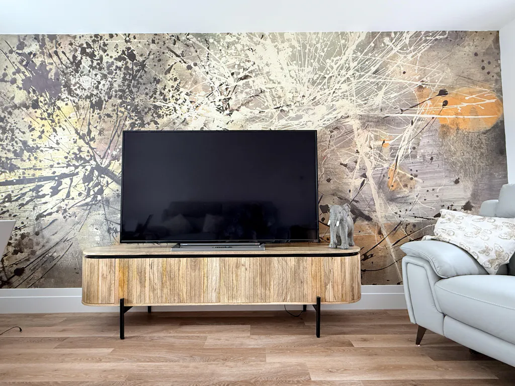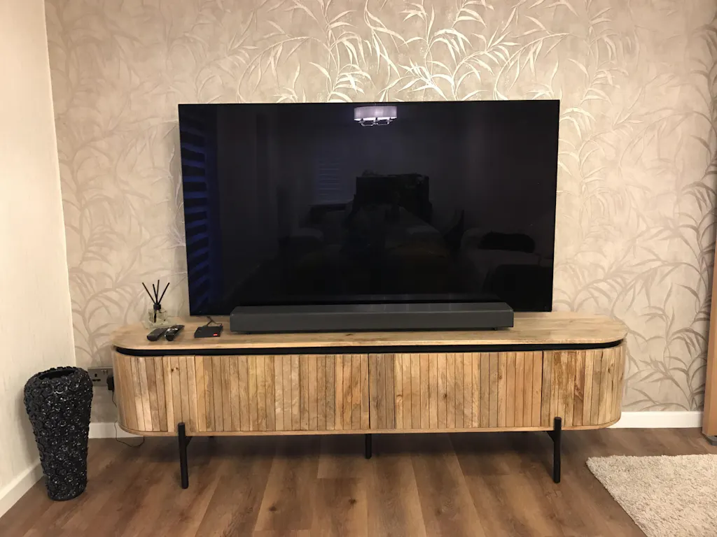 The TV unit is made of mango wood goes perfectly with contemporary space