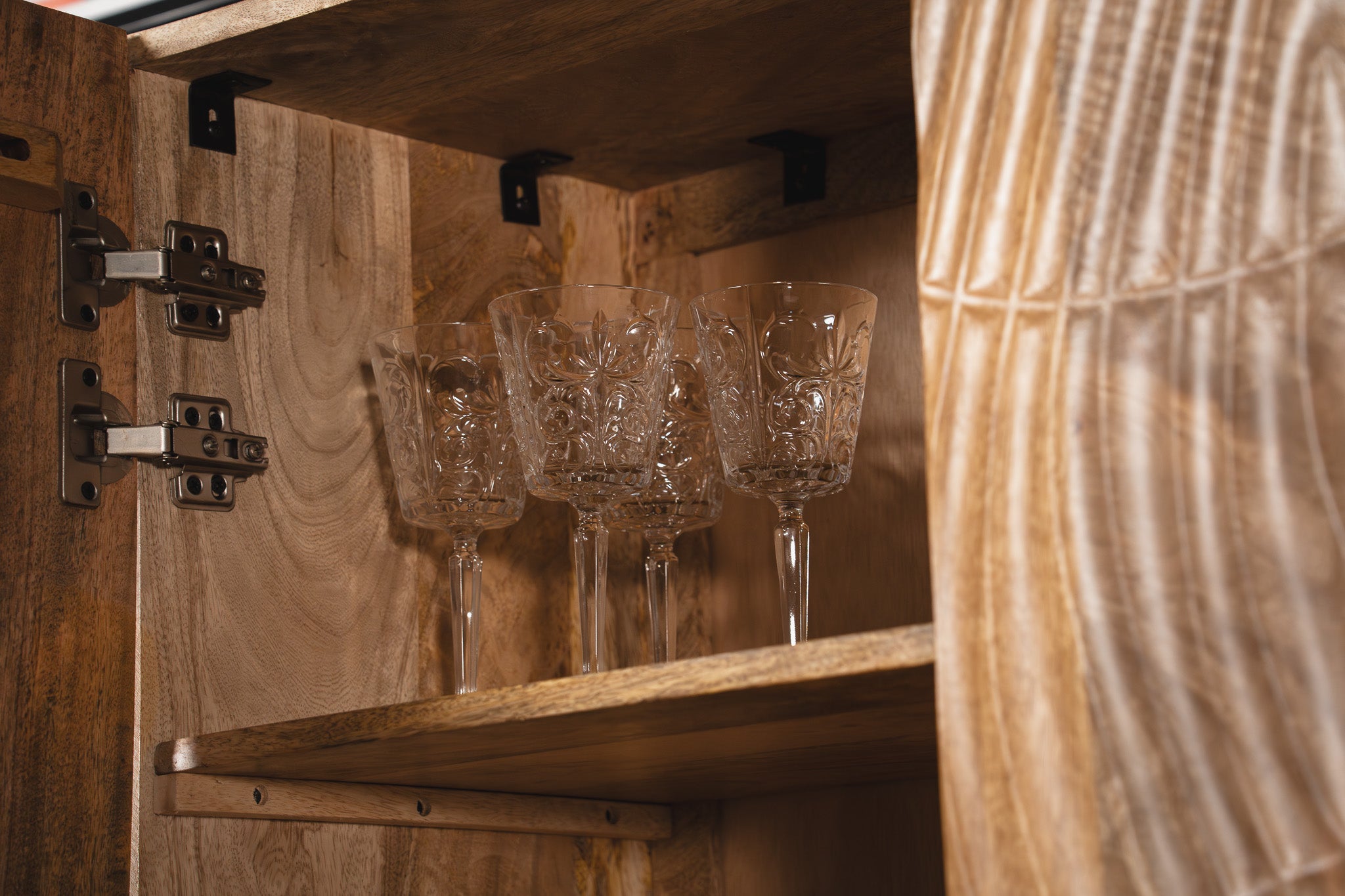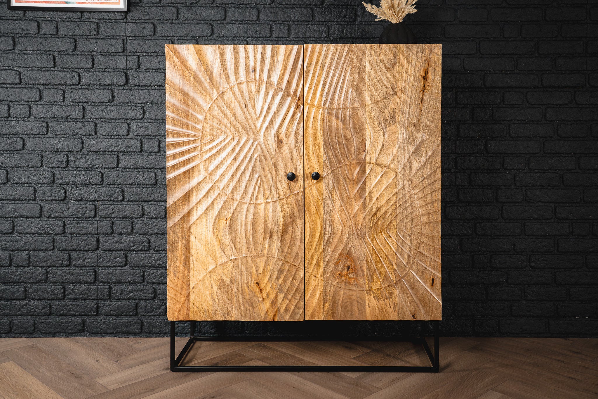 This highboard showcases artisanal craftsmanship and natural beauty. Its body is made from solid mango wood with striking 3D hand-carved patterns across the doors. Resting on a sleek metal frame, it blends durability with artistic flair while offering generous storage capacity.