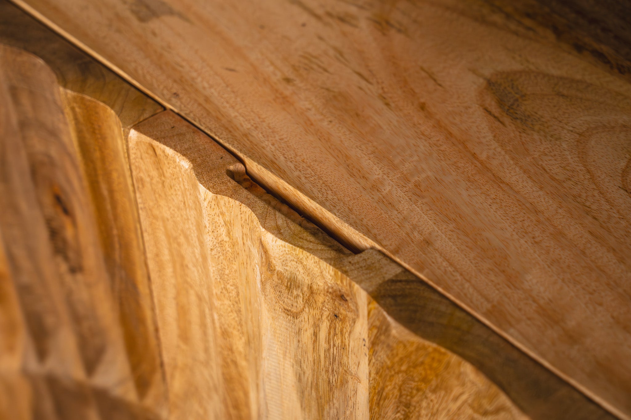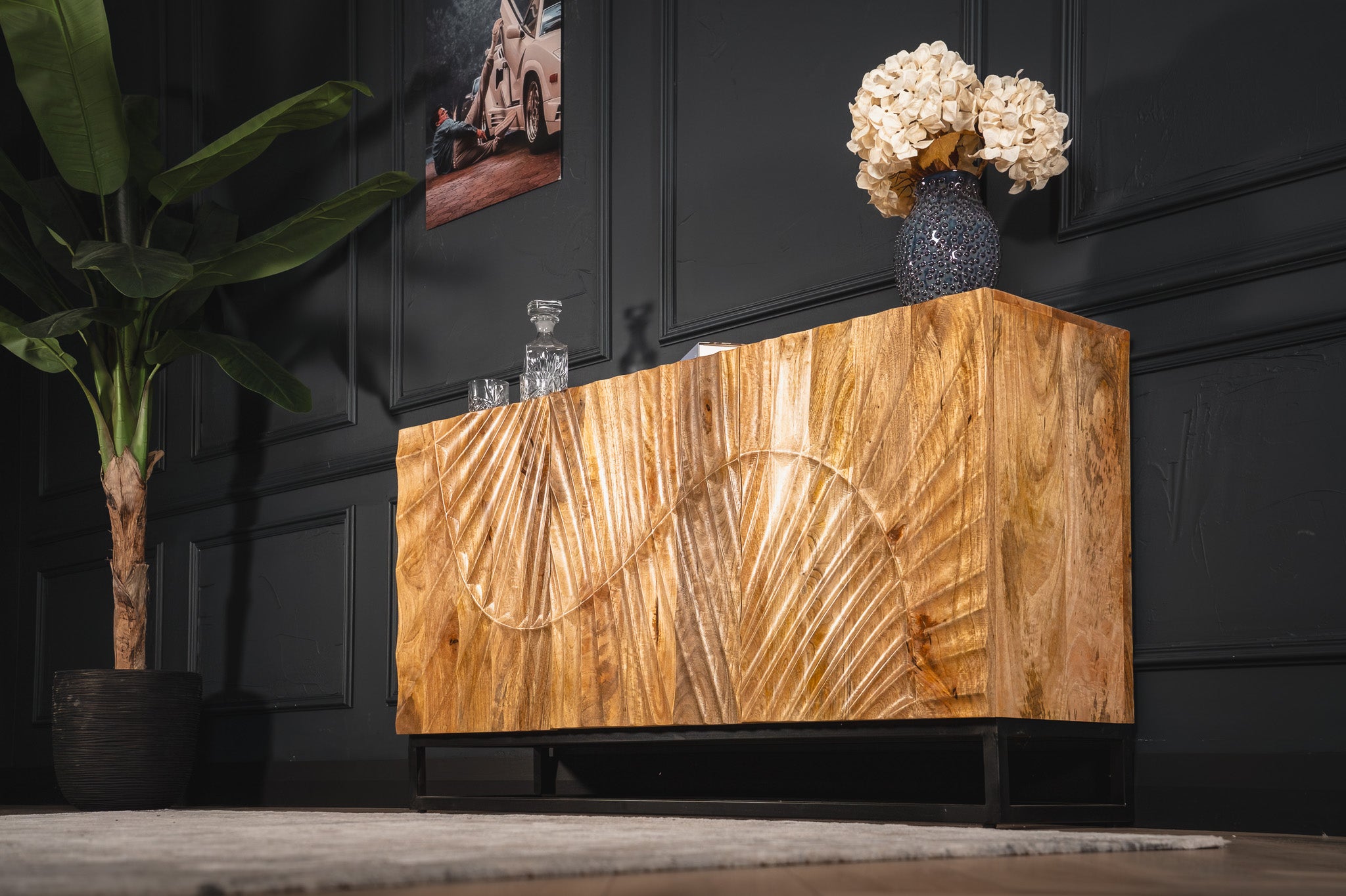 This sideboard attracts everyone's attention. Do you love the extraordinary and still need a little storage space in your ambience? Then our extravagant sideboard is just right for your home. A solid body made of mango wood rests on a simple metal frame. The highlight of the board is the elaborate 3D carving attached to the front. The organic shapes seem to flow over the surface and impress with their extraordinary look and feel.